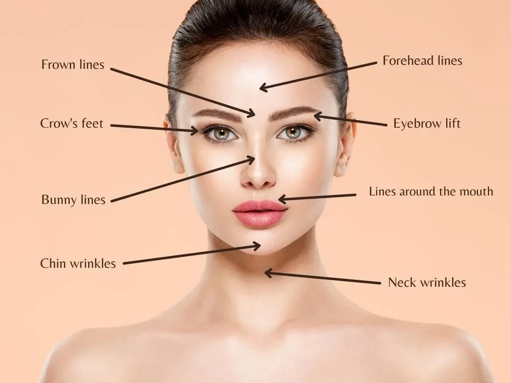 Botox Zones: Forehead lines, glabellar “11s,” crow’s feet, bunny lines, neck bands