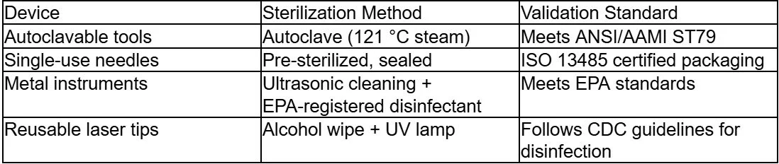 Equipment used for injectable or invasive treatments must undergo validated sterilization methods. Common practices include: